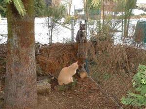 Teddy hat es endlich geschafft, daß diese dicke rotweiße Katze nicht mehr über unseren Rasen läuft. Und der kleinen Mieze von gegenüber klaut er immer ihren weißen Plüschball. Meine Dosies lachen immer, wenn Teddy mit seiner Beute ankommt und die Langhaarige bringt die Beute immer wieder zurück - damit Teddy sich wieder drüben ins Haus schleichen und sie klauen kann.